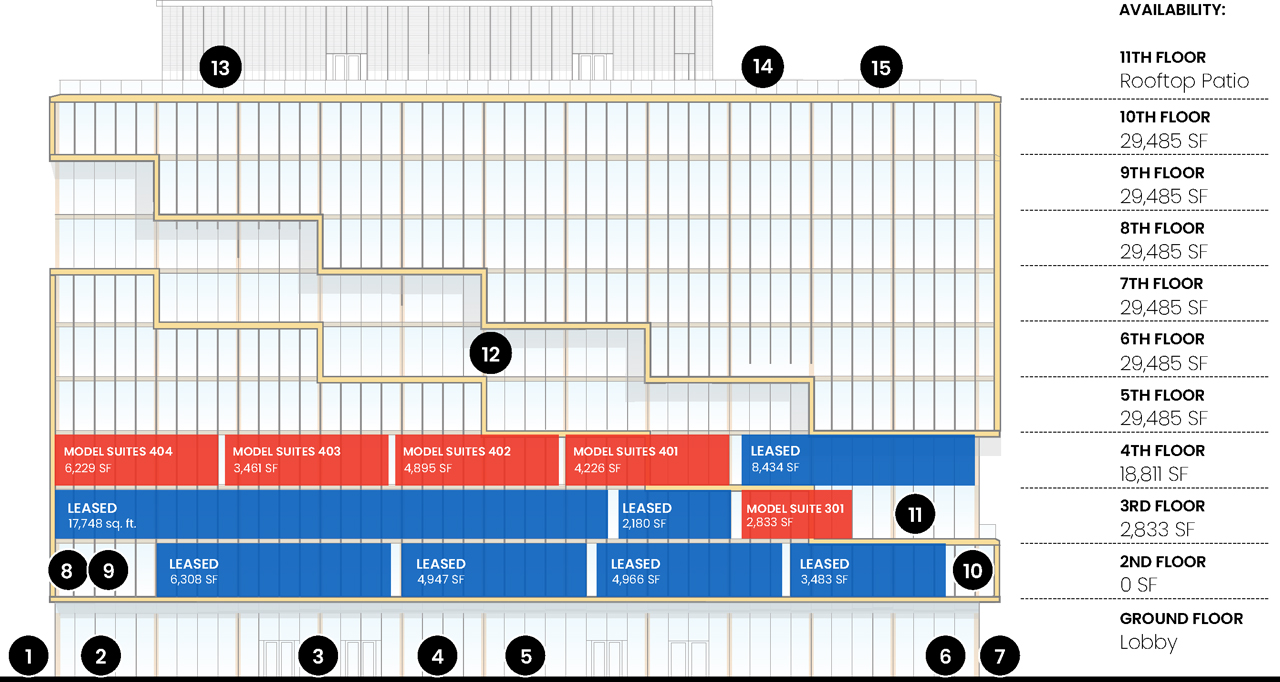• 10’-3” floor-to-ceiling windows provides natural light that penetrates to the core of the building